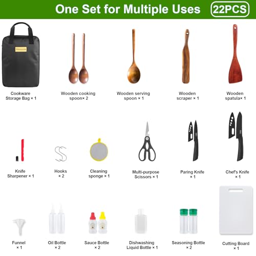 Camping Cooking Cookware Set – Upgraded 22PCS Camp Kitchen Organizer with Wooden Utensils, Portable Gear for Outdoor Dining Essentials
