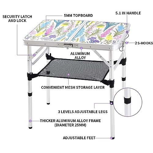 Folding Camping Table 2ft Portable Pinic Table Adjustable Height Small Card Table Aluminum Foldable Lightweight with Carry Handle for Outdoor Indoor Hiking Camp BBQ Beach (Blooming Floral)