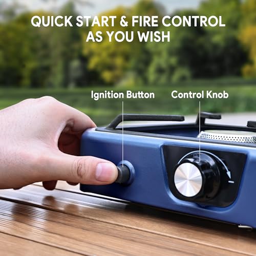 Upgraded WINKIZA Camping Stove Propane with Cutting Board, Portable Propane Camp Stove with 8,000 BTU, Adjustable Burner with Piezo Ignition & Carrying Handle, Portable Gas Stove for Camping, BBQ