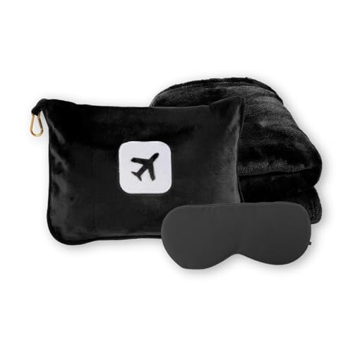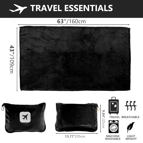 Portable Travel Blanket and Pillow – Premium Soft 2 in 1 Airplane Blanket with Compact Pack Soft Bag Pillowcase, Hand Luggage Sleeve and Backpack Clip (Black)