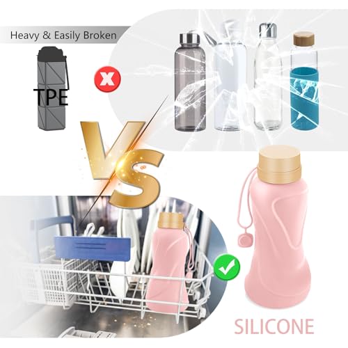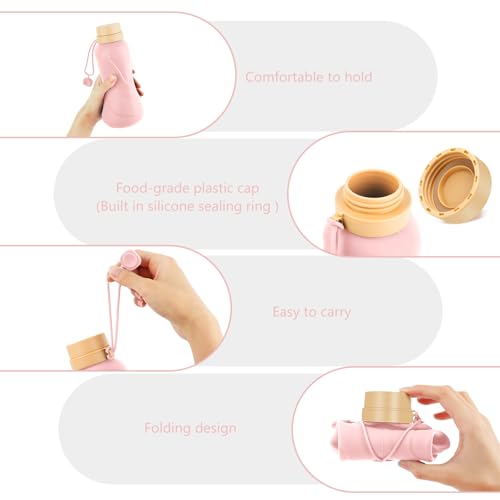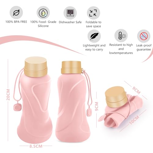 Collapsible Water Bottles,650ml,Leak Proof,Reuseable BPA Free Silicone Foldable Water Bottles,Durable Lightweight for Travel Gym Camping Hiking,Compact Size Portable Sports Water Bottle (Pink)