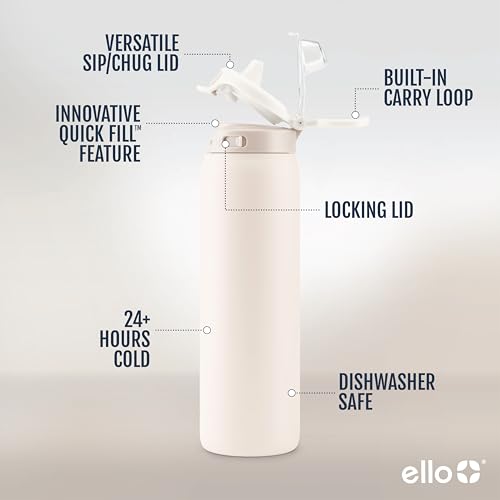 Ello Pop & Fill Stainless Steel Water Bottle with Quick Fill Technology, Double Walled Vacuum Insulated Metal, Leak Proof Locking Lid, Sip & Chug, BPA Free, Holiday Gift for Him Her, 22oz, 32oz, 40oz