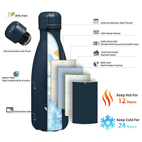 Double Wall Vacuum Water Bottle: Keeps your drink ice cold for up to 24 hours and hot for up to 12 hours.Leak proof and dust proof design ensures the beverages stay securely contained.Non-sweat exterior prevents condensation and keeps your hands dry