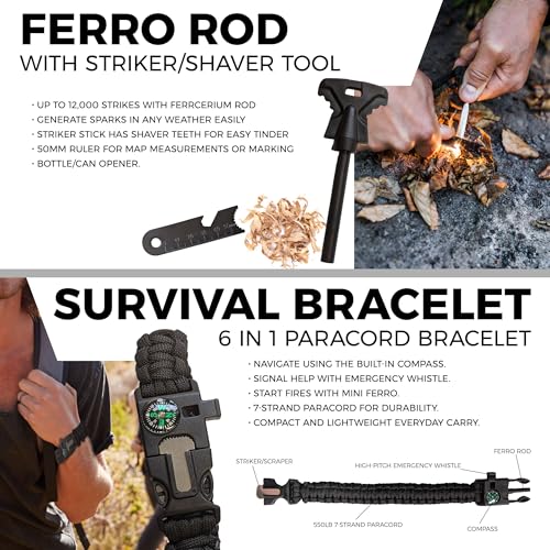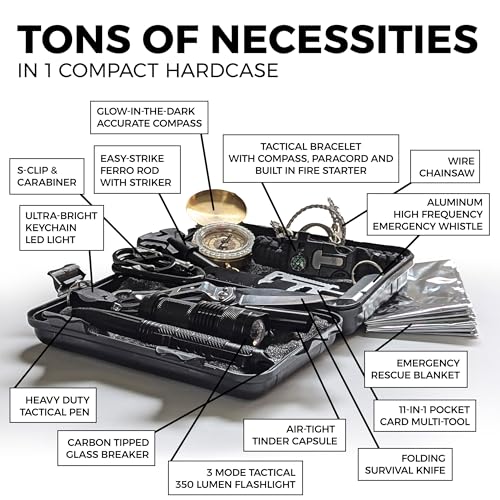 15 IN 1 EMERGENCY KIT – Includes a Screwdriver, survival knife, compass, emergency blanket, flint stone, wire saw, flashlight, credit card knife, tactical pen, paracord bracelet, whistle, carabiner & waterproof black box.