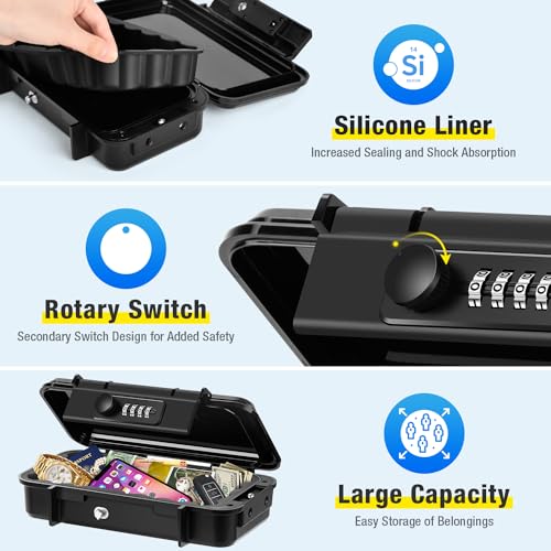 WATERPROOF AND DURABLE: The beach safe is made of high-strength PC, ABS shell and silicone lining, waterproof, drop-proof and crash-proof; professional grade sealed waterproof design for beach and pool