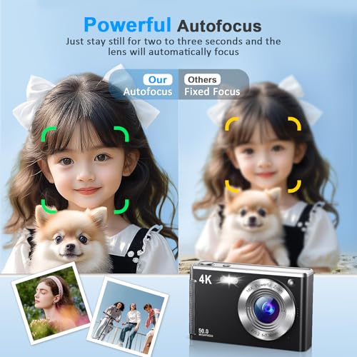 4K Ultra HD Video & 50MP Pro-Grade Photos: This portable digital camera is powered by an advanced CMOS sensor and precision optics, which can deliver stunning 4K video recording and 50MP high-resolution photos. This point and shoot digital camera can easily capture distant landscapes or magnify subtle textures without losing clarity. A compact design makes it perfect gift for adventurers, content creators, and memory-keepers.