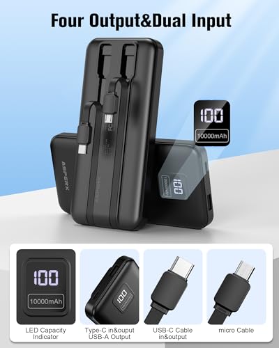 AsperX 2-Pack 10000mAh Portable Charger with Built-in Cables, USB-C Output Power Bank Fast Charging, LED Display Travel Essential Battery Pack for iPhone Android Google Pixel LG iPad Heated Vest, etc