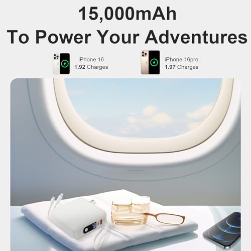 Portable charger with built in cable and AC wall plug: 15000mAh Power Bank portable phone charger comes with two types of cables, C-type and Lightning type, allowing you to say goodbye to messy charging cables. The built-in AC wall plug allows you to charge directly from the wall socket, eliminating the need to carry adapters and cables everywhere. Therefore, essential items for travel, hiking, camping, air travel, and cycling! Don’t worry about difficulty charging with this battery pack