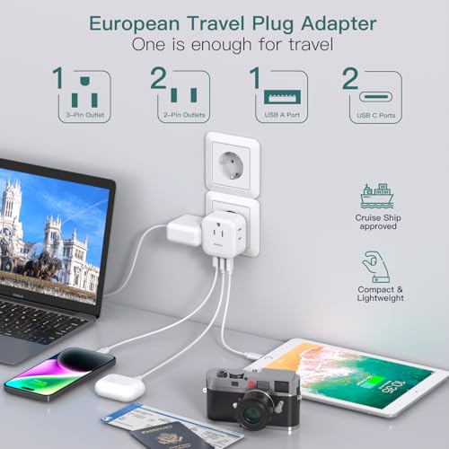 2 Pack European Travel Plug Adapter, US to Europe Plug Adapter with 3 Outlets 3 USB Charging Ports(2 USB C), Type C Adapter Travel Essentials to Most Europe EU Spain Italy France Germany Iceland