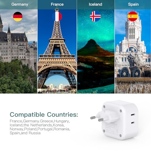 【6-IN-1 European Power Adapter】- A single European Type C socket is converted to 3 American AC outlets and 3 USB charging ports by the European travel plug adaptor. Maximum capacity: 2500 watts (250 volts and 10 amps). With the 4-side design, 6 devices can be charged at once without interference. Larger space makes power adapter Europe easier to fit all electric equipment without blocking; No need to carry extra adapter. Grab it and GO.