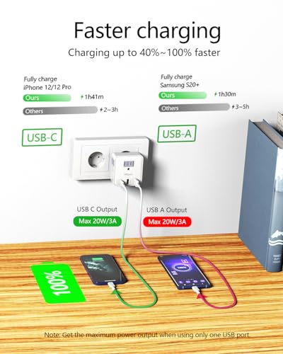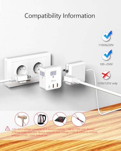 6-in-1 Plug Adapter: This European travel plug adapter takes up one EU socket, expands it into 3 US sockets and 2 USB-A 1 USB-C ports, allowing you to charge 6 devices simultaneously.Compared to other versions, the USB-C port with PD technology,it charge fast for iPhones,iPads and AirPods with output: 5V/3A ,9V/2.22A or 12V/1.67A; USB-A port with QC technology,It charge fast for cell phones ,tablets,earphones,power bank etc with output: 5V/3A,9V/2.22A or 12V/1.67A.