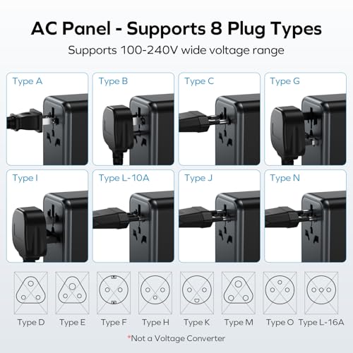 5 + 1 Fast Charging: This international adapter is equipped with 3 USB-C ports, 2 USB-A ports and 1 AC outlet (Max 1100W at 110V & 2500W at 250V) and supports PD3.0 & QC3.0 fast charging. One of the USB-C PD ports can even reach an incredible high speed of 70W. It is ideal for your USB devices, especially laptop, smartphone, tablet, power bank, camera, etc.