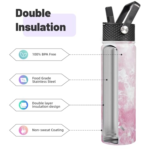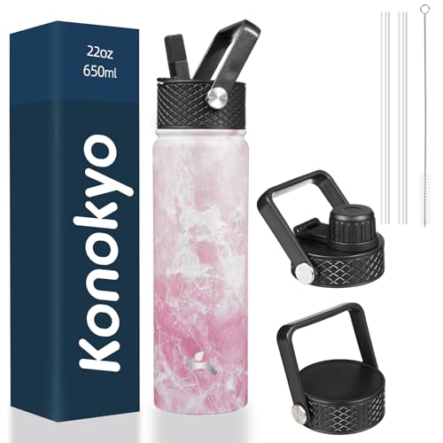 Konokyo Insulated Water Bottle 22oz Stainless Steel Sport Water Bottles With 3 Lids,Marble Blossom