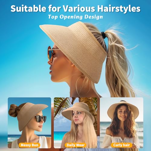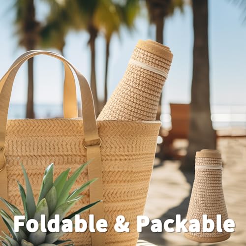 Sun Hats for Women Straw Roll-Up Beach Wide Brim Visor UV UPF Packable Foldable Travel Hat