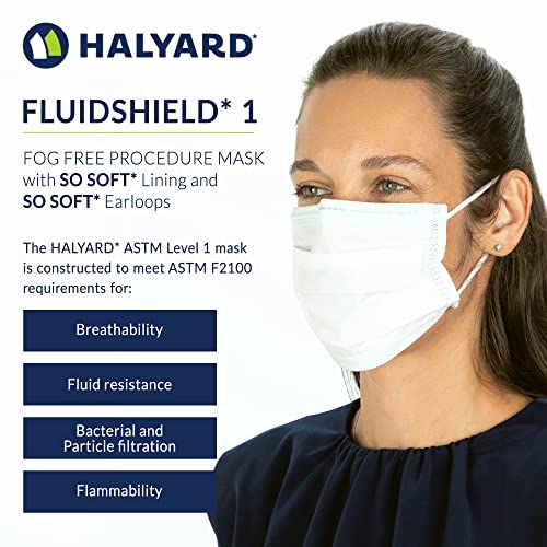 HALYARD FLUIDSHIELD 1 Fog-Free Disposable Procedure Mask,with SO SOFT Lining&SO SOFT Earloops,Pleat-Style,White,Level 1,41802