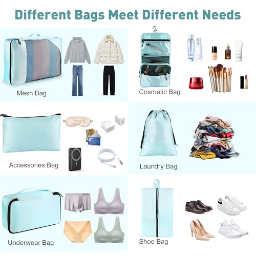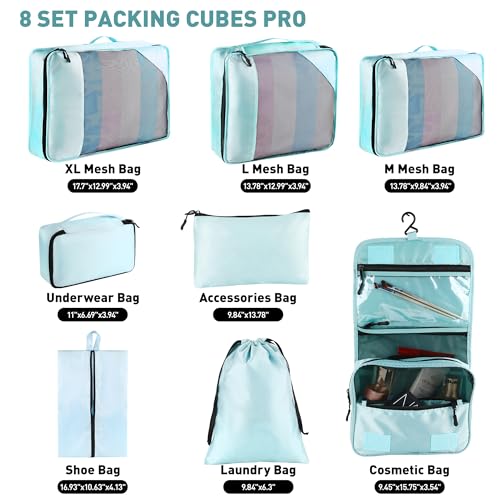 8 Set Packing Cubes for Travel Women Men Kids, Mesh Suitcase Organizer Bags Set for Luggage, 4 Sizes Extra Large, Large, Medium, Small, Travel Camping Essentials Accessories, Lake Blue