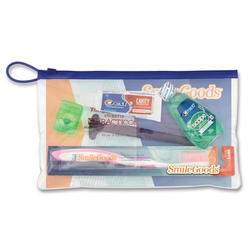 Travel Kit Includes: A425 SmileGoods toothbrush with an ergonomic non-slip grip, multi-level ortho-friendly bristles and a vented toothbrush cover, SmileGoods waxed mint floss, 1.5 oz bottle of Scope mouthwash, 0.85 oz. tube of Crest toothpaste and plastic tongue cleaner.